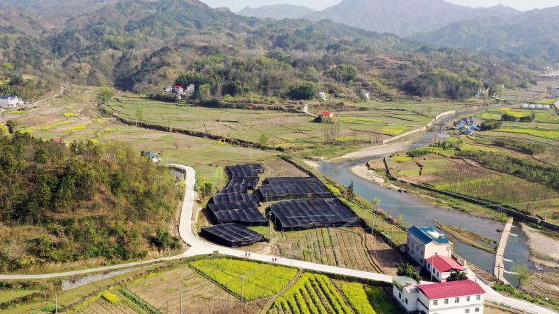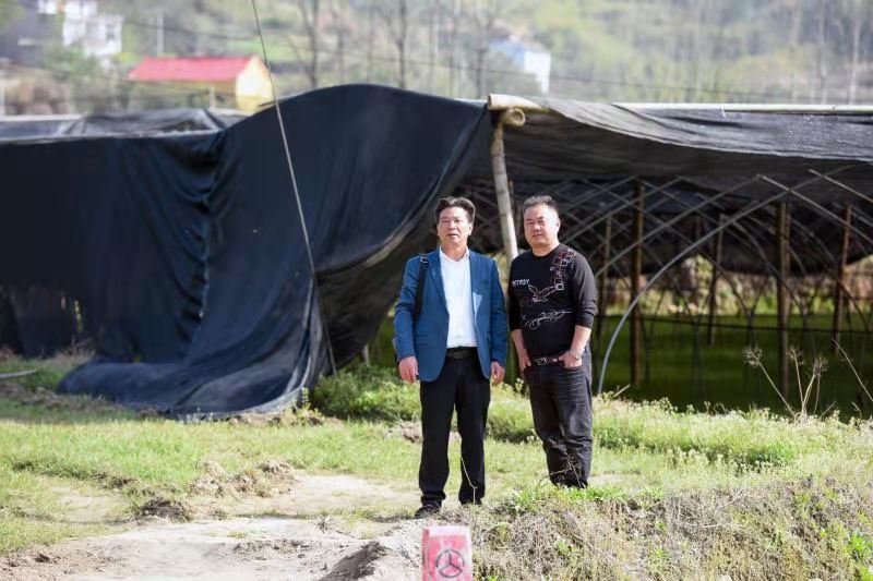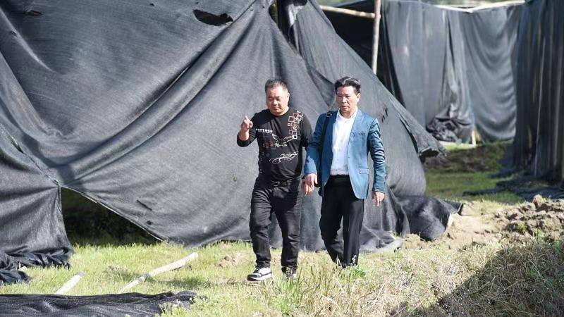 3月28日下午,康美来集团董事长余春富,驱车到达金寨县果子园乡龙墩村,考察2021年仿野生灵芝种植基地,基地负责人黄总陪同考察。