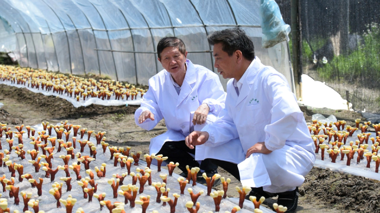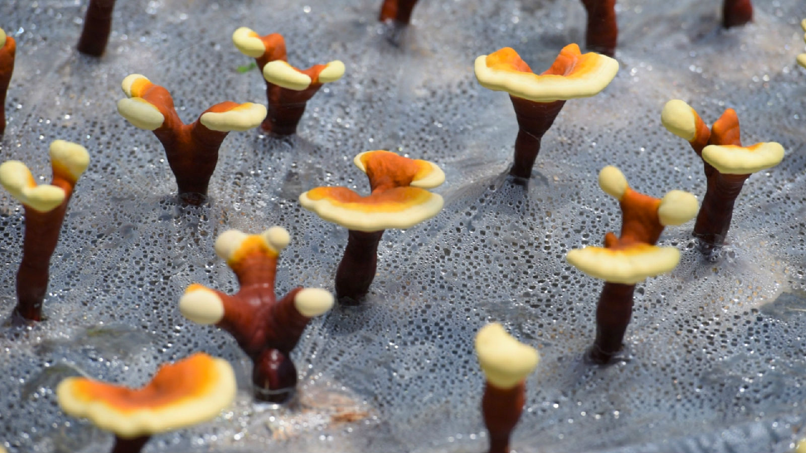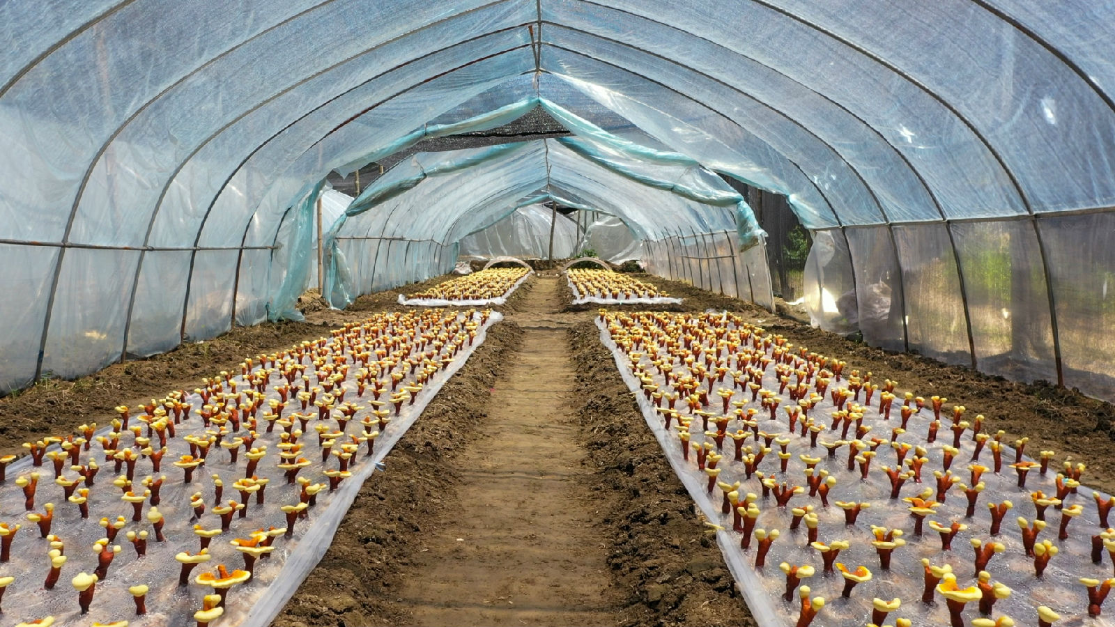 走进灵芝基地,一排排整齐的大棚严整壮阔,与四周连绵的青山相映成趣,棚内一棵棵灵芝整齐排列,朵朵嫩蕾色彩娇艳,构成了一幅美丽的夏日画卷。黄总介绍:这块基地面积20亩,菌棒已开始发芽,正处于菌杆生长阶段。沈业寿教授考察后指出:现蕾阶段的灵芝需要精心观察护理,防止杂菌感染。