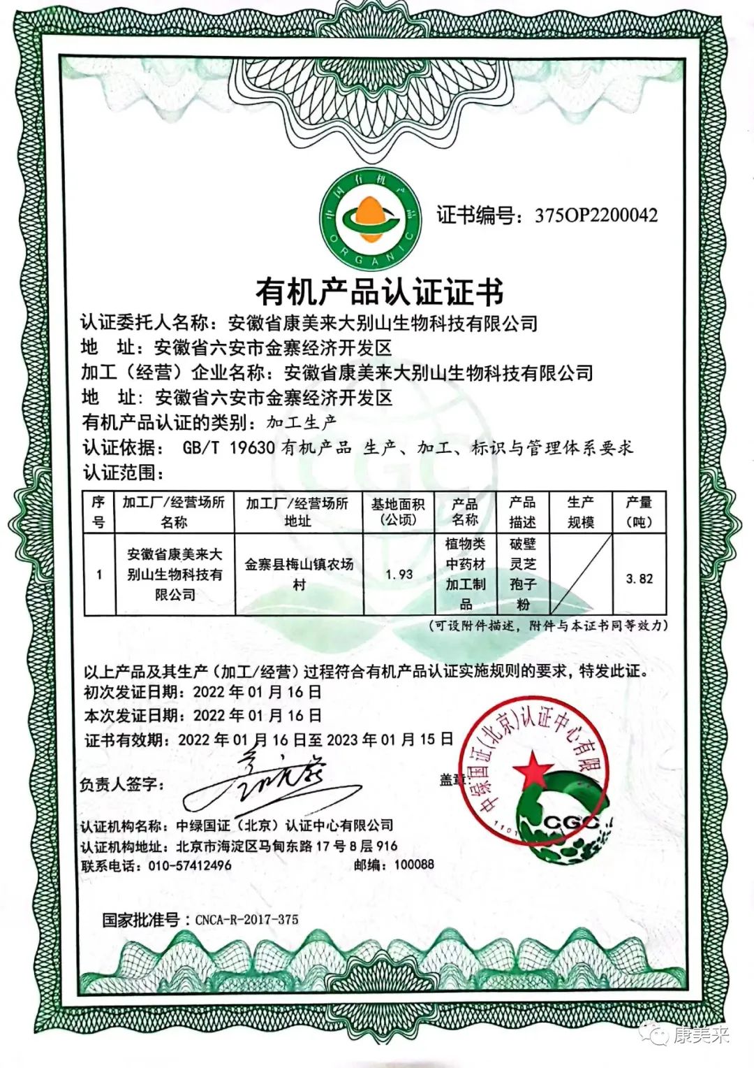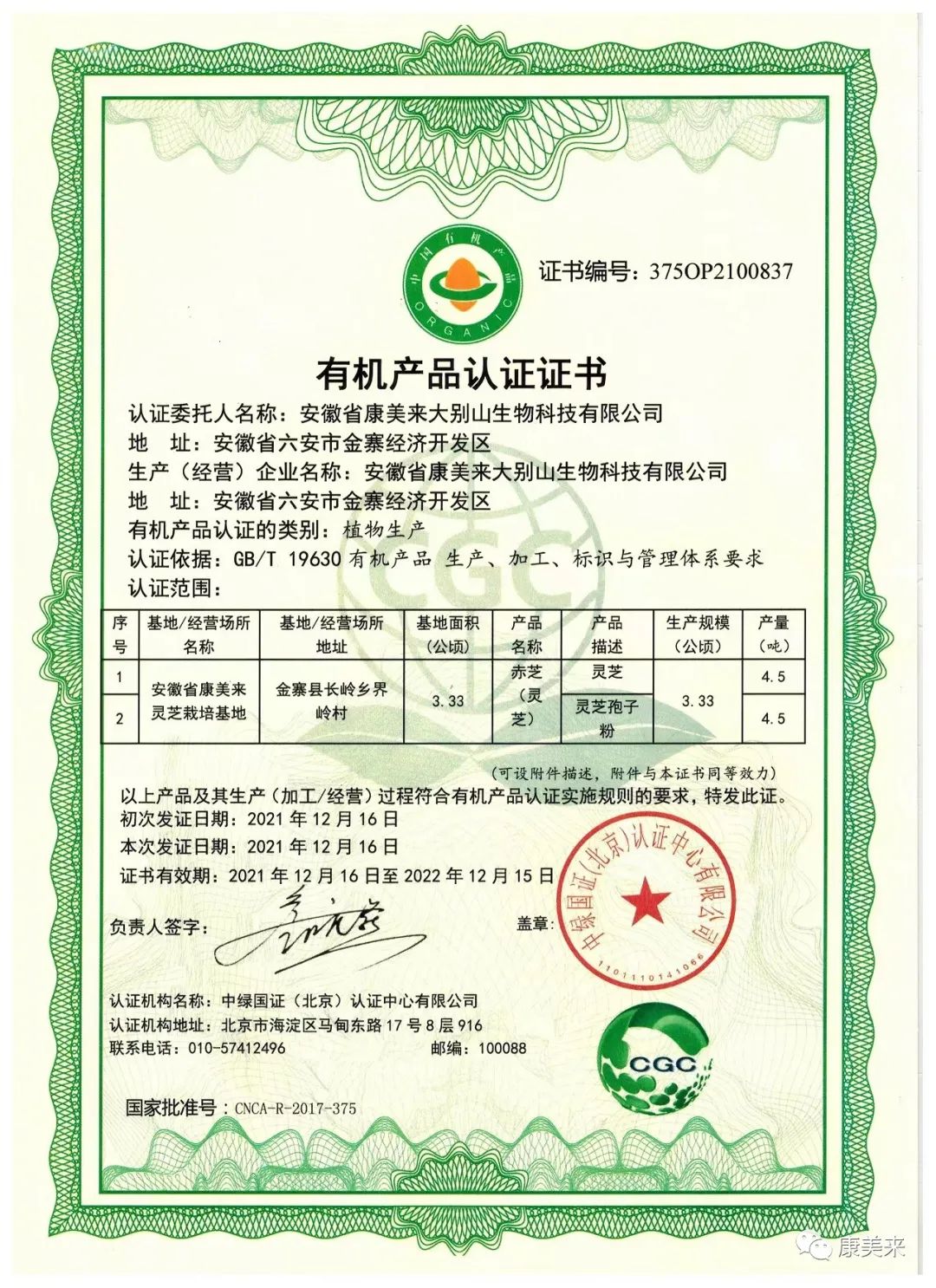 康美来破壁灵芝孢子粉作为国产保健食品的高端品牌,自2016年以来一直致力于灵芝的有机技术,而且是有机植物生产+有机加工生产,做到从原料到成品的全链条的有机生产,每年通过第三方权威机构认证。