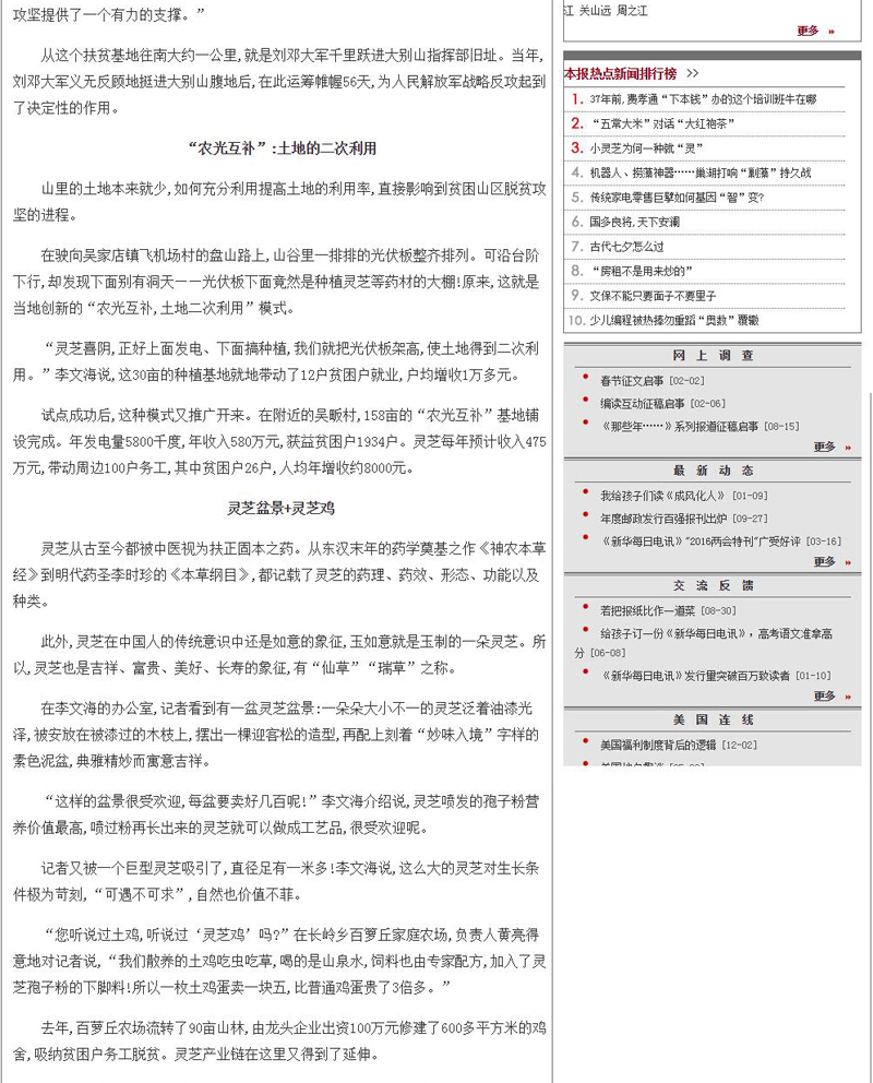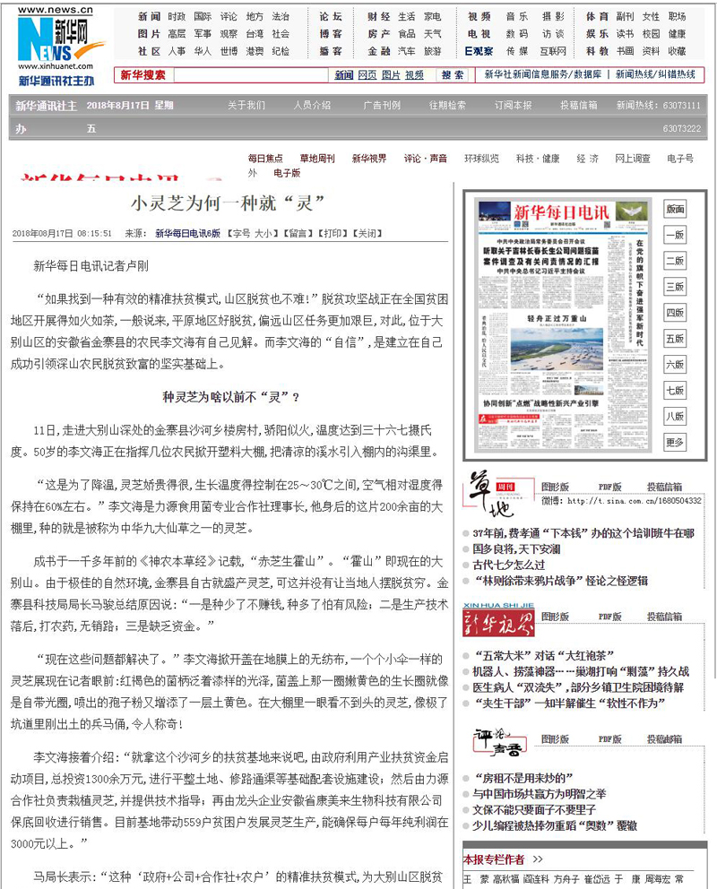 8月17日,新华社旗下平面报纸《新华每日电讯》主版刊发“小灵芝为何一种就灵”的记者文章,报道康美来公司大别山灵芝基地产业精准扶贫模式。