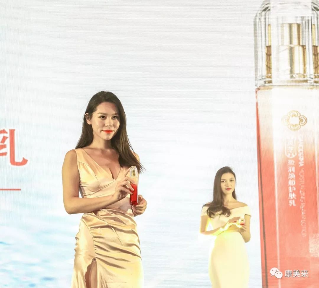 会上,邀请了香港模特展示灵芝系列护肤品,新品与佳人同台相映,光彩夺目,主持人同时画外音朗读余董亲自赋诗一首“再问罗敷年几何?”