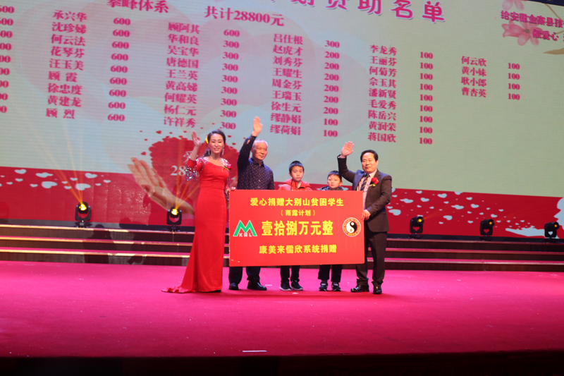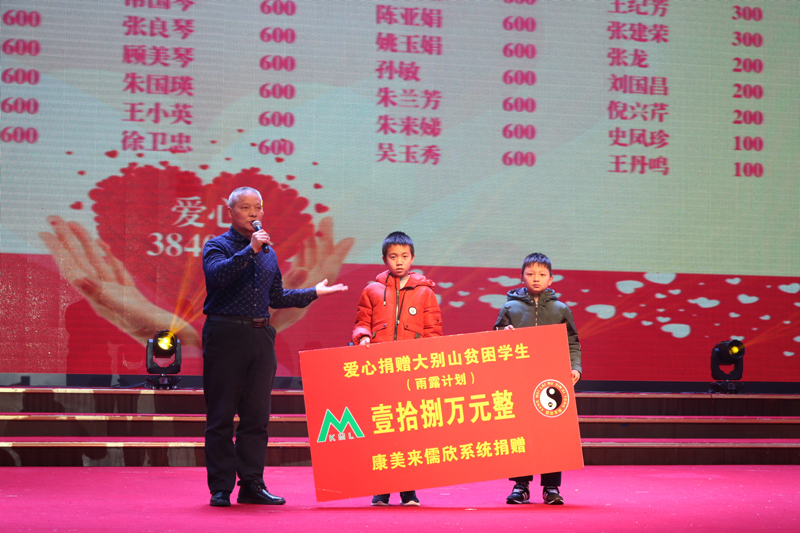 1月5日--6日,康美来儒欣系统举办扶贫公益活动,向金寨县沙河中心小学、金寨县长岭乡胜利教学点、金寨县长岭乡洪畈教学点、金寨县燕子河树林教学点、金寨县吴家店镇太平教学点、金寨县龙潭教学点等学校贫困学生捐款18万元。