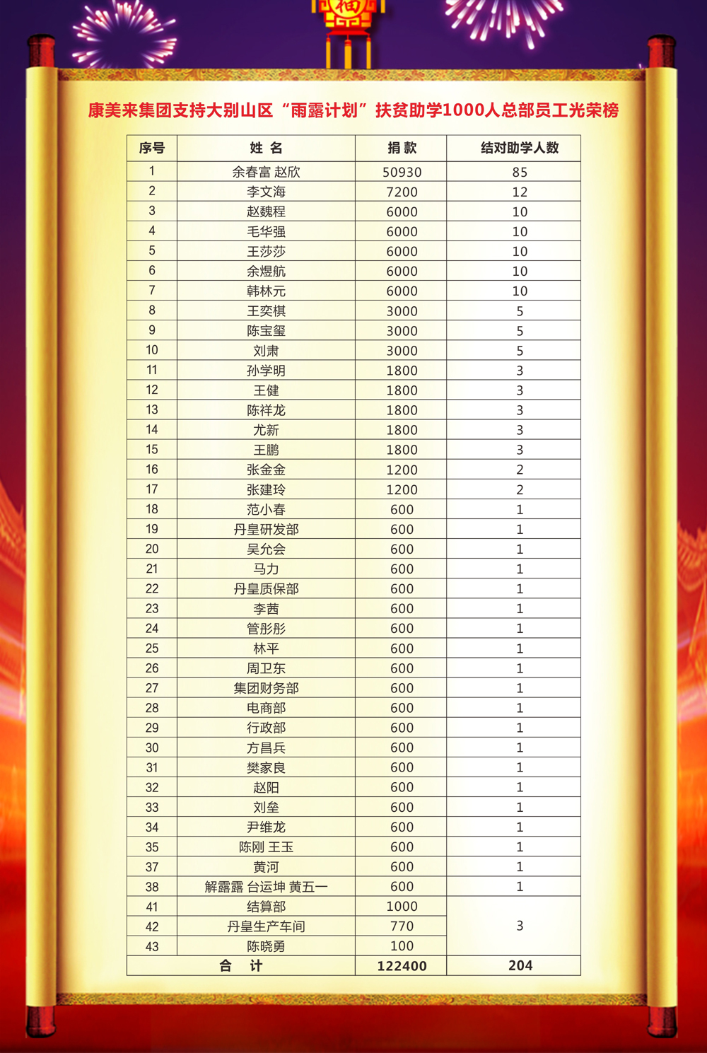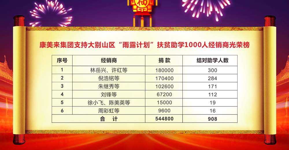 康美来集团广大经销商和干部职工支持金寨县政府“雨露计划”2019年度实施扶贫助学结对大别山区贫困学生1000人行动,实际达成结对1112人,总捐款667200元。现发布光荣榜,予以表扬。