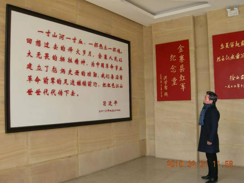 走进博物馆大门,习近平、江泽民、刘伯承、徐向前、吴邦国等题词在墙上整齐排列。在习近平亲笔题写的大字前,余春富董事长肃然起敬,默默念词:“一寸山河一寸血,一抷热土一抷魂。回想过去的烽火岁月,金寨人民以大无畏的牺牲精神,为中国革命事业建立了彪炳史册的功勋,我们要沿着革命前辈的足迹继续前行,把红色江山世世代代传下去”。