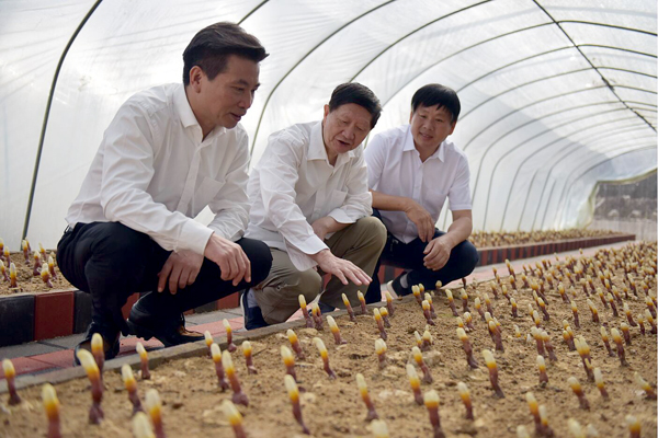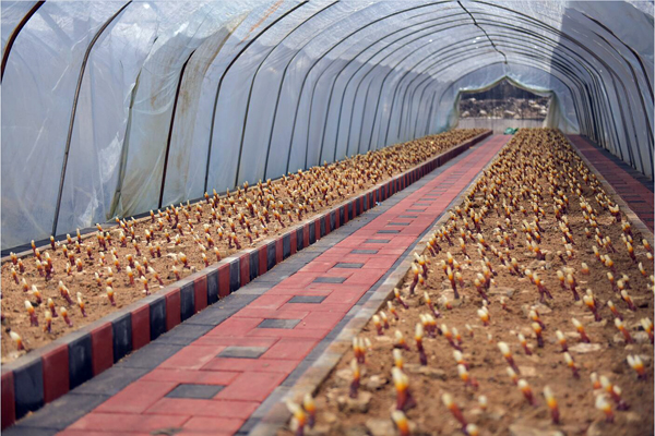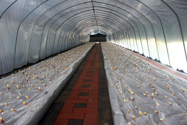 早期栽培的灵芝已长出嫩芽,色泽鲜艳,整齐排列,迎接远方的客人。