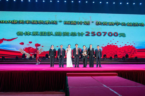 2019年12月30日,康美来儒欣经销商团队在江阴召开2019年度“雨露计划”扶贫助学公益活动暨表彰盛典。