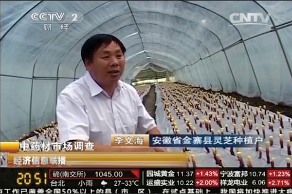 五、县政府部门指定康美来基地作为金寨县灵芝种植基地的代表,向央视推荐。李文海是种植能手的代表。