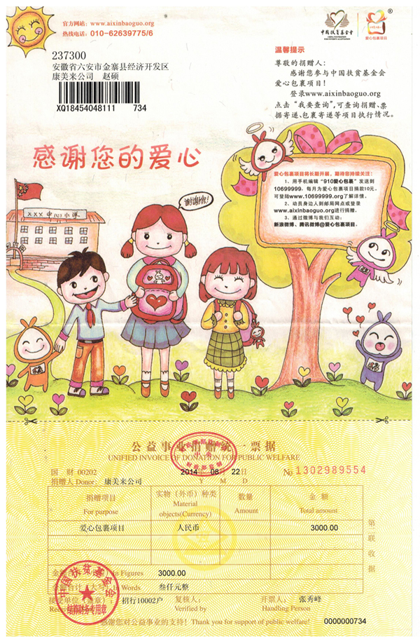 为了帮助贫困地区的小学生能够顺利上学,缓解学生家庭的生活压力,2014年8月,康美来公司积极参加中国扶贫基金会发起的全民公益活动,组织了爱心包裹温暖行动,踊跃捐款3000元。